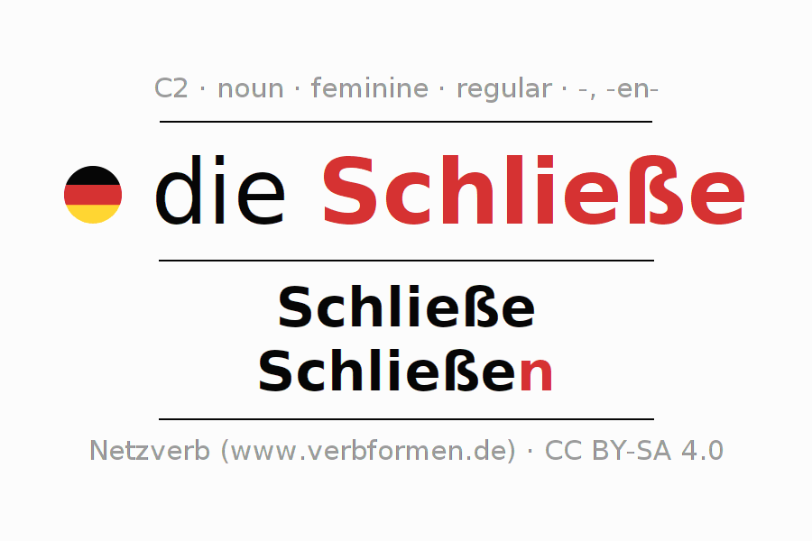 The declension of Schließe as a table with all forms in singular (singular) and plural (plural) and in all four cases nominative (1st case), genitive (2nd case), dative (3rd case) and accusative (4th case). Especially for German learners the correct declension of the word Schließe is crucial.