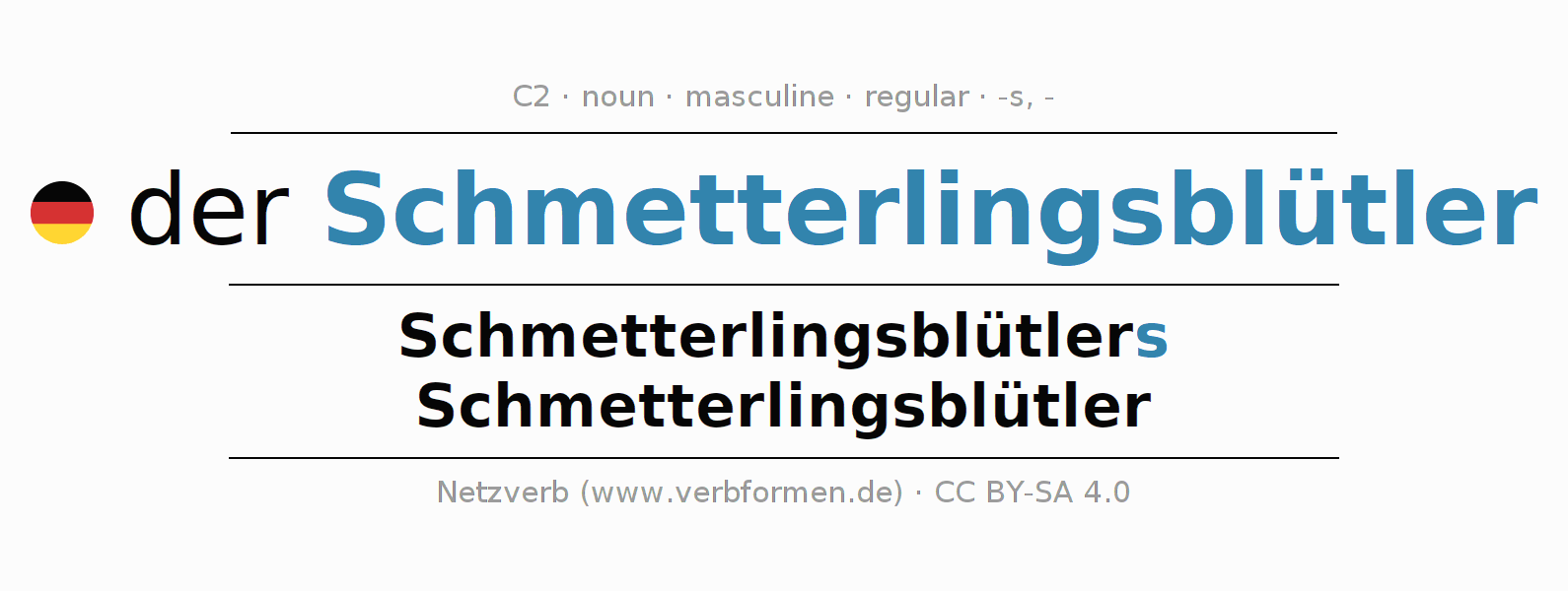 - Singular: der Schmetterlingsblütler, des Schmetterlingsblütlers, dem Schmetterlingsblütler, den Schmetterlingsblütler