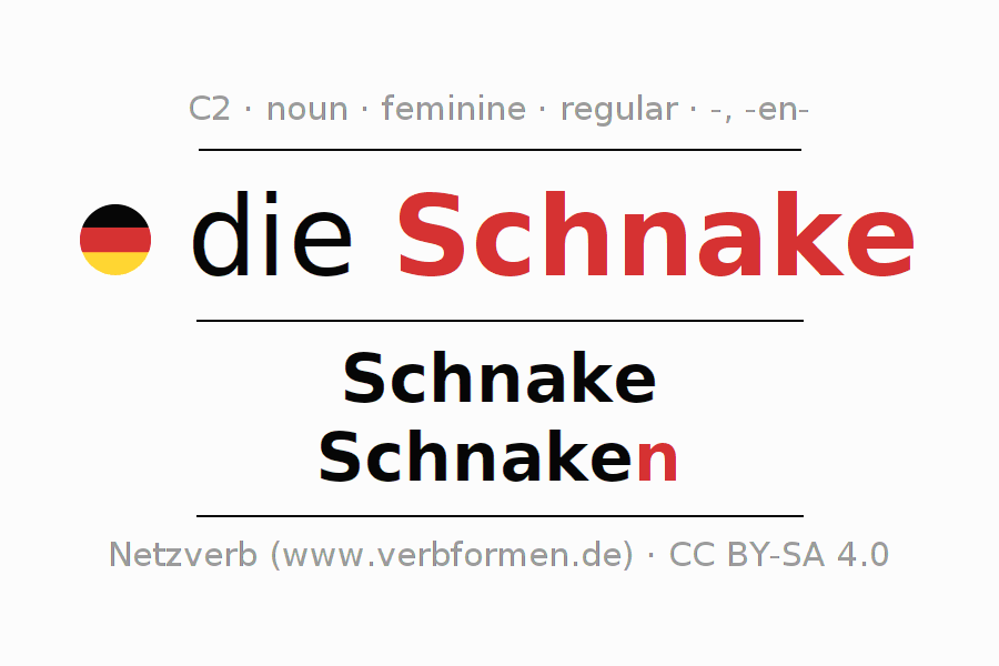 The declension of Schnake as a table with all forms in singular (singular) and plural (plural) and in all four cases nominative (1st case), genitive (2nd case), dative (3rd case) and accusative (4th case). Especially for German learners the correct declension of the word Schnake is crucial.