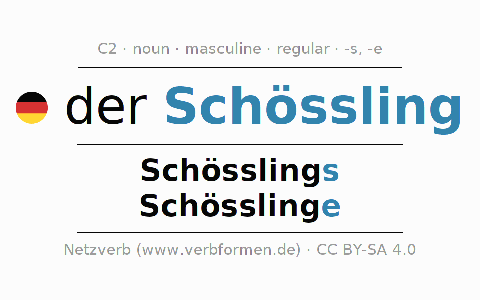 The declension of Schössling as a table with all forms in singular (singular) and plural (plural) and in all four cases nominative (1st case), genitive (2nd case), dative (3rd case) and accusative (4th case). Especially for German learners the correct declension of the word Schössling is crucial.