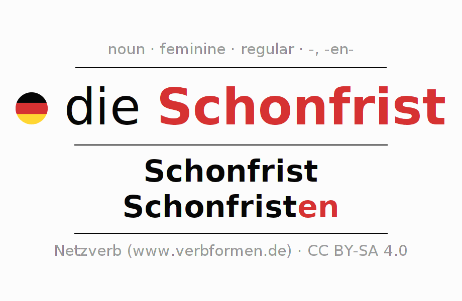 The declension of Schonfrist as a table with all forms in singular (singular) and plural (plural) and in all four cases nominative (1st case), genitive (2nd case), dative (3rd case) and accusative (4th case). Especially for German learners the correct declension of the word Schonfrist is crucial.