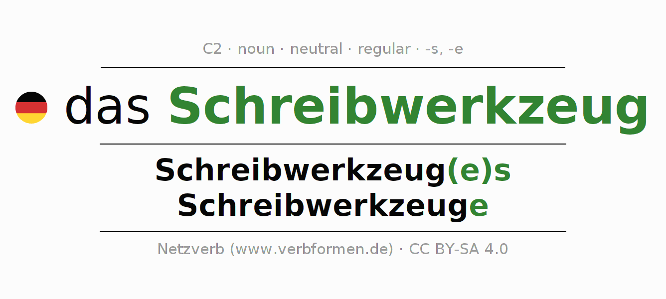 The declension of Schreibwerkzeug as a table with all forms in singular (singular) and plural (plural) and in all four cases nominative (1st case), genitive (2nd case), dative (3rd case) and accusative (4th case). Especially for German learners the correct declension of the word Schreibwerkzeug is crucial.