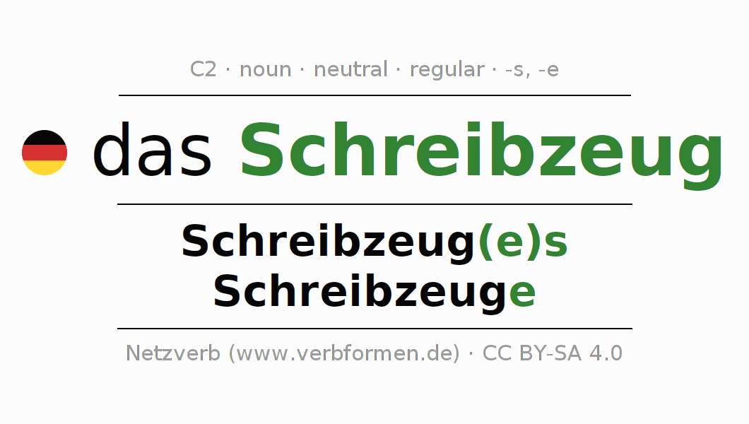 The declension of Schreibzeug as a table with all forms in singular (singular) and plural (plural) and in all four cases nominative (1st case), genitive (2nd case), dative (3rd case) and accusative (4th case). Especially for German learners the correct declension of the word Schreibzeug is crucial.