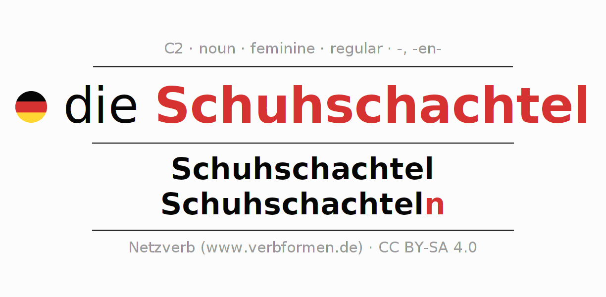 - Plural: die Schuhschachteln, der Schuhschachteln, den Schuhschachteln, die Schuhschachteln