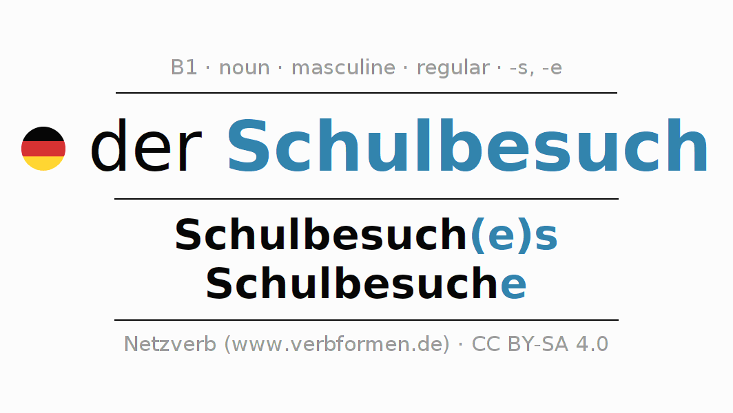 - Plural: die Schulbesuche, der Schulbesuche, den Schulbesuchen, die Schulbesuche