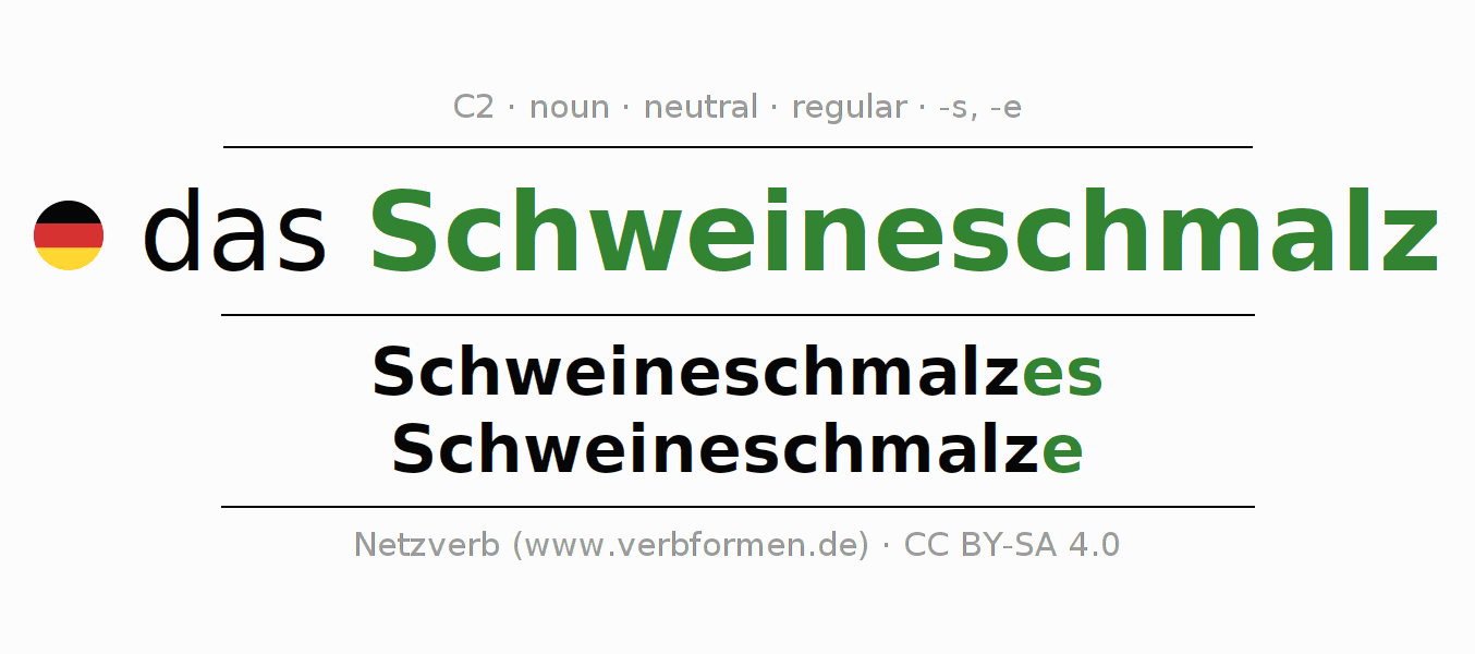 - Singular: das Schweineschmalz, des Schweineschmalzes, dem Schweineschmalz(e), das Schweineschmalz