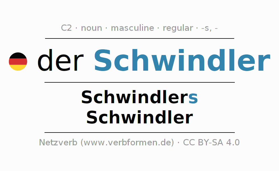 - Plural: die Schwindler, der Schwindler, den Schwindlern, die Schwindler