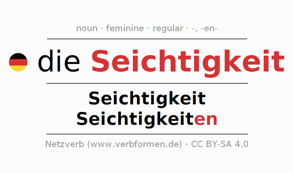 The declension of Seichtigkeit as a table with all forms in singular (singular) and plural (plural) and in all four cases nominative (1st case), genitive (2nd case), dative (3rd case) and accusative (4th case). Especially for German learners the correct declension of the word Seichtigkeit is crucial.