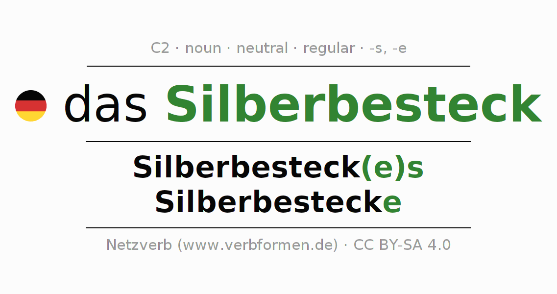 The declension of Silberbesteck as a table with all forms in singular (singular) and plural (plural) and in all four cases nominative (1st case), genitive (2nd case), dative (3rd case) and accusative (4th case). Especially for German learners the correct declension of the word Silberbesteck is crucial.