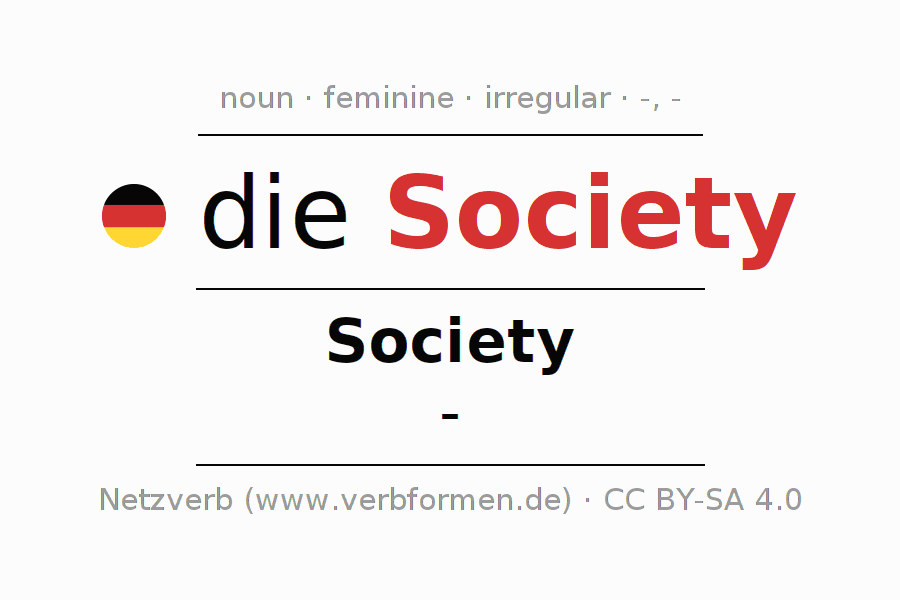 The declension of Society as a table with all forms in singular (singular) and plural (plural) and in all four cases nominative (1st case), genitive (2nd case), dative (3rd case) and accusative (4th case). Especially for German learners the correct declension of the word Society is crucial.