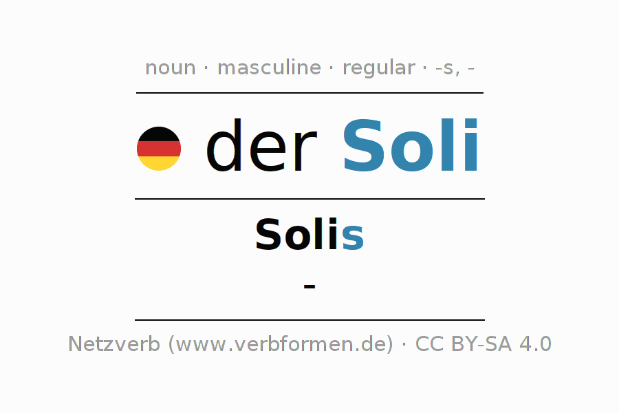 The declension of the noun Soli (solidarity surcharge, solidarity tax) is in singular genitive Solis and in the plural nominative -. The noun Soli is declined with the declension endings s/-. It does not form plurals. The voice of Soli is maskuline and the article "der". Here you can not only inflect Soli but also all German nouns. Comments ☆