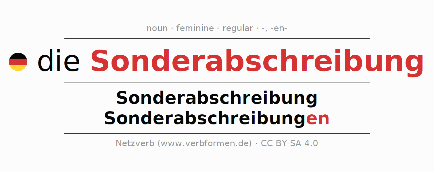 - Plural: die Sonderabschreibungen, der Sonderabschreibungen, den Sonderabschreibungen, die Sonderabschreibungen