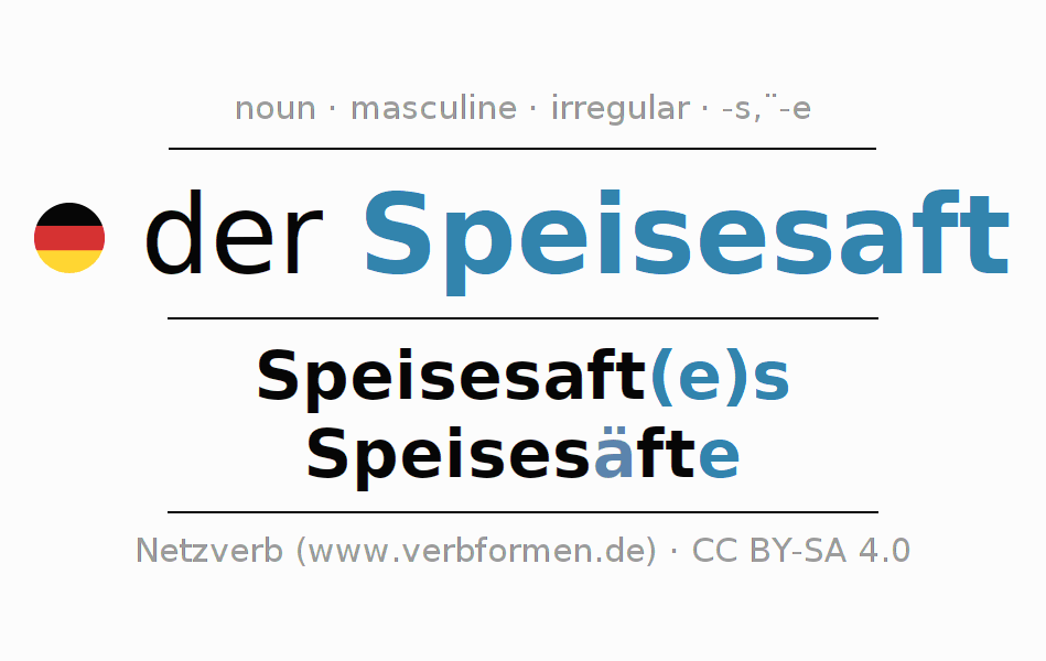 - Plural: die Speisesäfte, der Speisesäfte, den Speisesäften, die Speisesäfte
