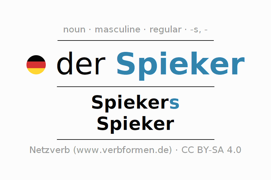 The declension of Spieker as a table with all forms in singular (singular) and plural (plural) and in all four cases nominative (1st case), genitive (2nd case), dative (3rd case) and accusative (4th case). Especially for German learners the correct declension of the word Spieker is crucial.