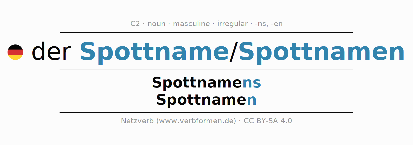 - Plural: die Spottnamen, der Spottnamen, den Spottnamen, die Spottnamen