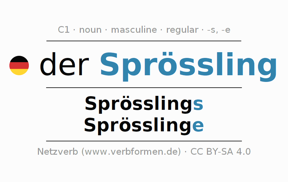 - Plural: die Sprösslinge, der Sprösslinge, den Sprösslingen, die Sprösslinge