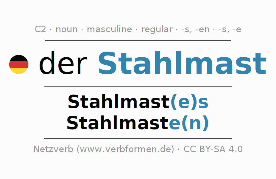 The declension of Stahlmast as a table with all forms in singular (singular) and plural (plural) and in all four cases nominative (1st case), genitive (2nd case), dative (3rd case) and accusative (4th case). Especially for German learners the correct declension of the word Stahlmast is crucial.