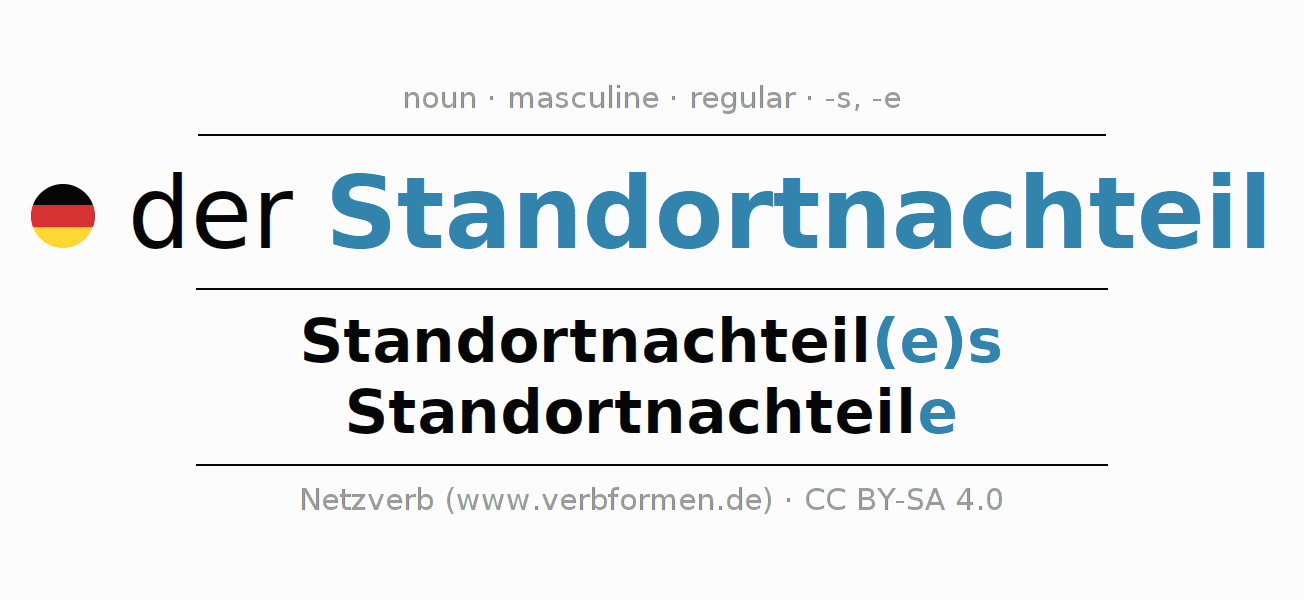 The declension of Standortnachteil as a table with all forms in singular (singular) and plural (plural) and in all four cases nominative (1st case), genitive (2nd case), dative (3rd case) and accusative (4th case). Especially for German learners the correct declension of the word Standortnachteil is crucial.