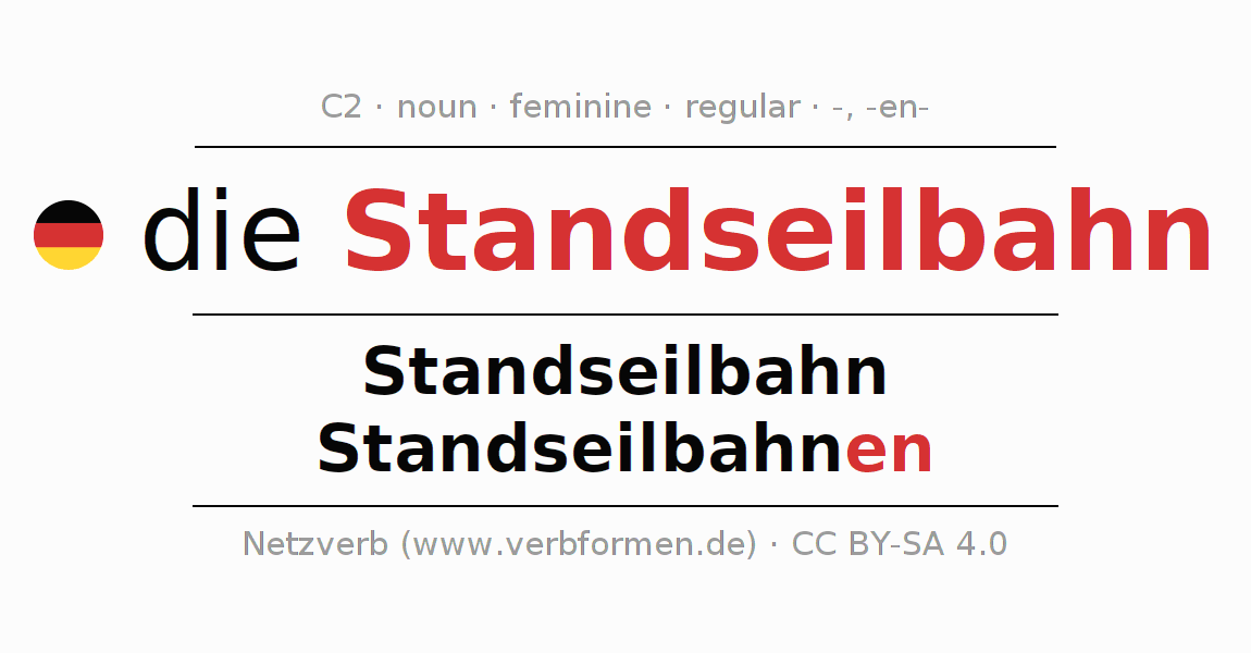 The declension of Standseilbahn as a table with all forms in singular (singular) and plural (plural) and in all four cases nominative (1st case), genitive (2nd case), dative (3rd case) and accusative (4th case). Especially for German learners the correct declension of the word Standseilbahn is crucial.