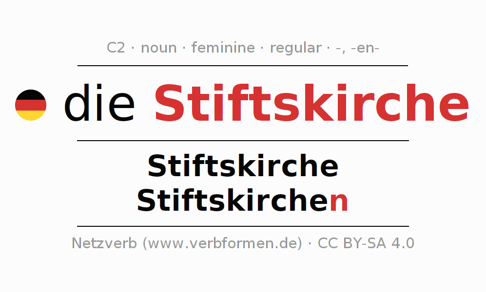 The declension of Stiftskirche as a table with all forms in singular (singular) and plural (plural) and in all four cases nominative (1st case), genitive (2nd case), dative (3rd case) and accusative (4th case). Especially for German learners the correct declension of the word Stiftskirche is crucial.