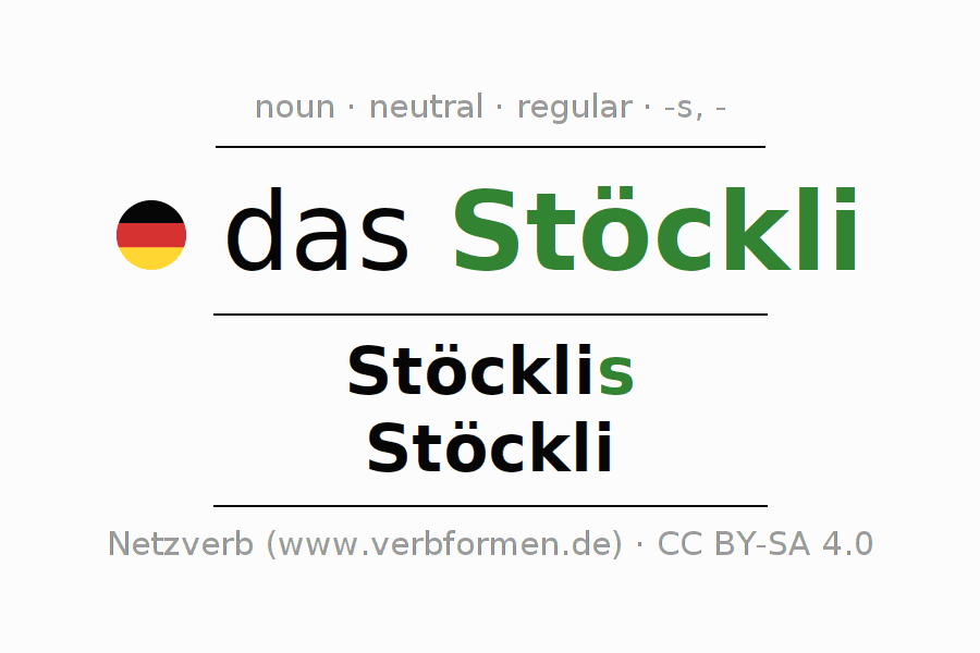 - Plural: die Stöckli, der Stöckli, den Stöckli, die Stöckli