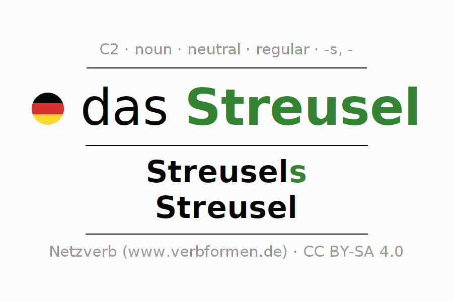 The declension of Streusel as a table with all forms in singular (singular) and plural (plural) and in all four cases nominative (1st case), genitive (2nd case), dative (3rd case) and accusative (4th case). Especially for German learners the correct declension of the word Streusel is crucial.