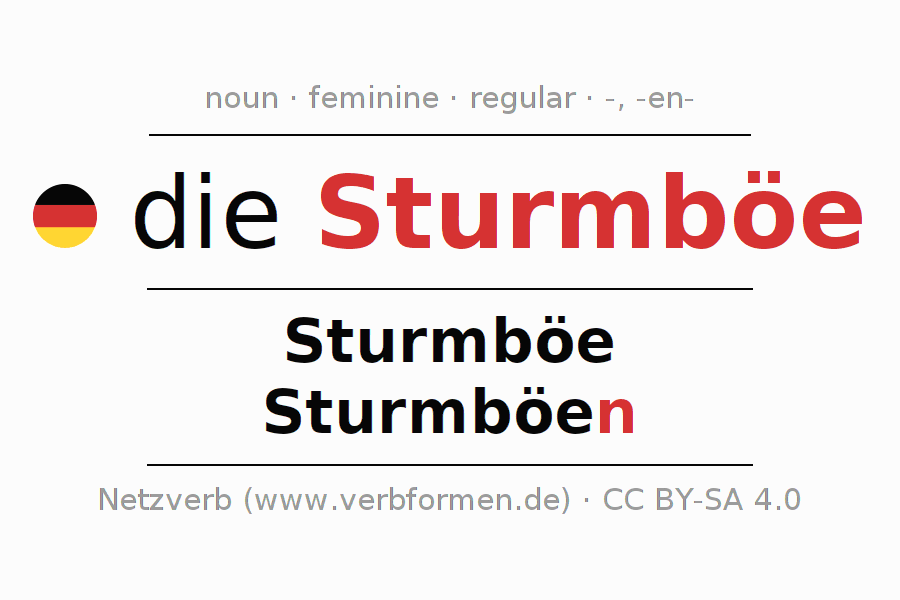 - Plural: die Sturmböen, der Sturmböen, den Sturmböen, die Sturmböen