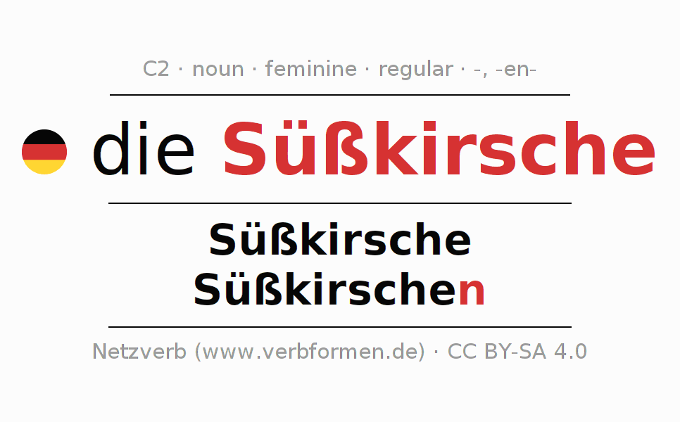 The declension of Süßkirsche as a table with all forms in singular (singular) and plural (plural) and in all four cases nominative (1st case), genitive (2nd case), dative (3rd case) and accusative (4th case). Especially for German learners the correct declension of the word Süßkirsche is crucial.