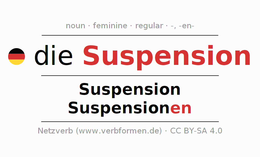 - Plural: die Suspensionen, der Suspensionen, den Suspensionen, die Suspensionen