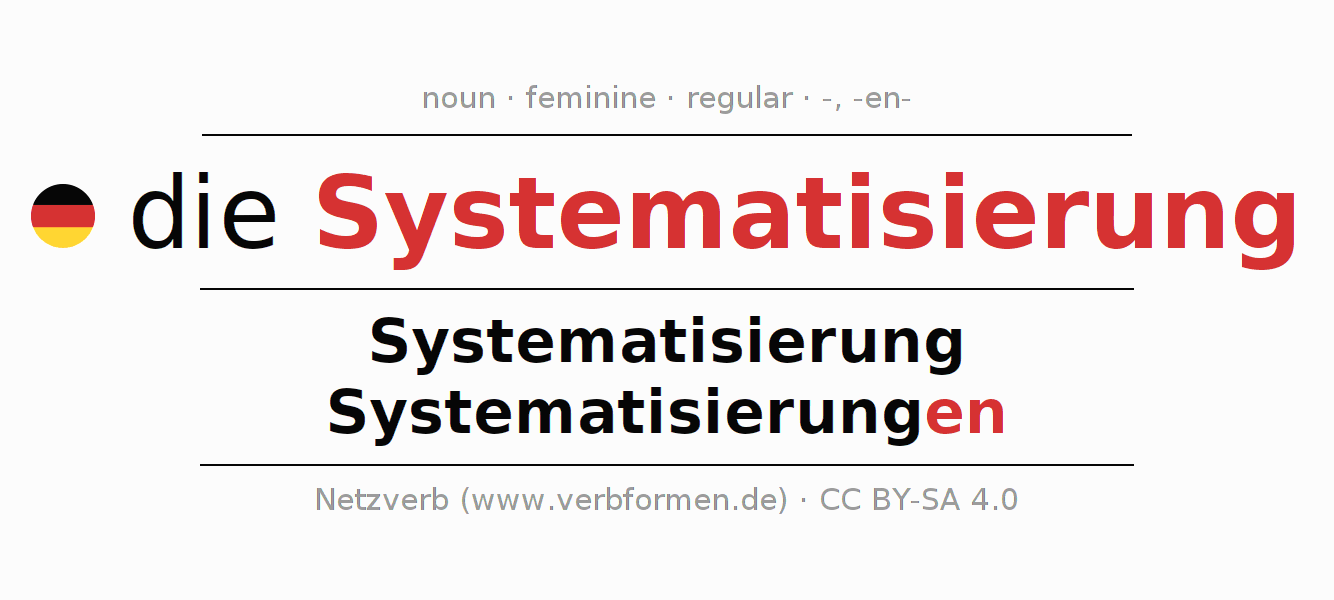 - Singular: die Systematisierung, der Systematisierung, der Systematisierung, die Systematisierung