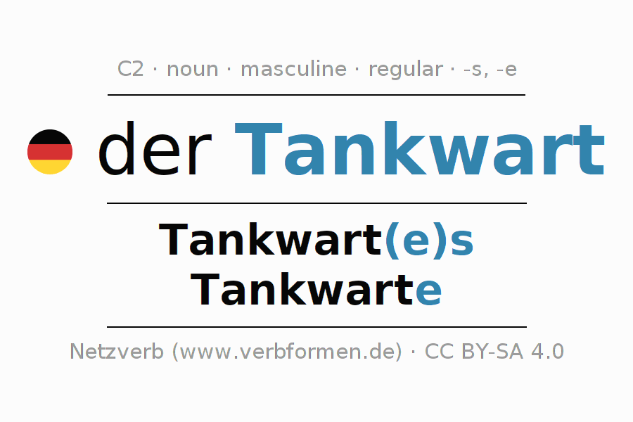 The declension of Tankwart as a table with all forms in singular (singular) and plural (plural) and in all four cases nominative (1st case), genitive (2nd case), dative (3rd case) and accusative (4th case). Especially for German learners the correct declension of the word Tankwart is crucial.