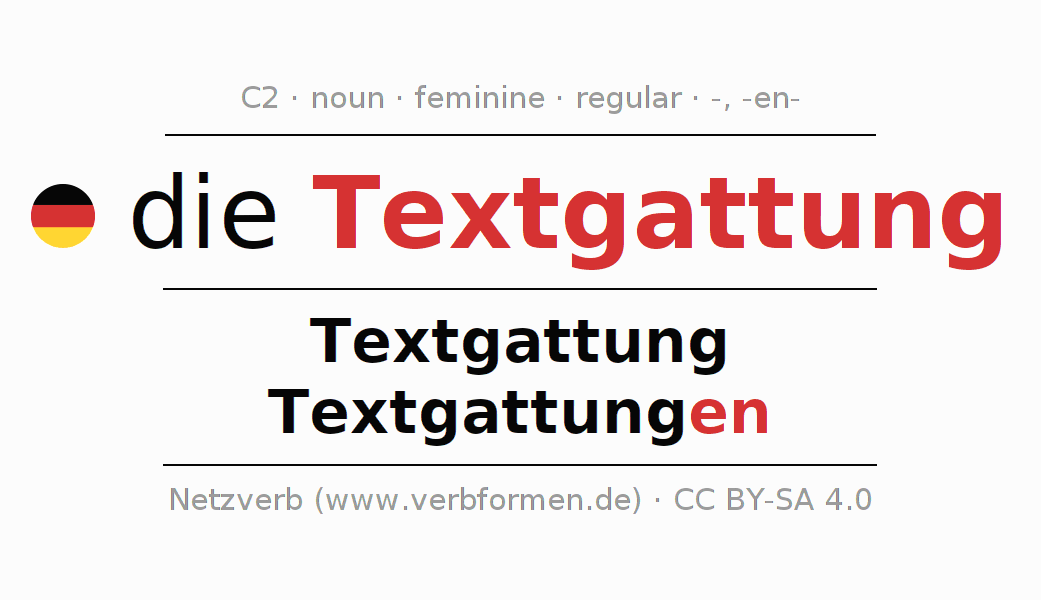 - Plural: die Textgattungen, der Textgattungen, den Textgattungen, die Textgattungen