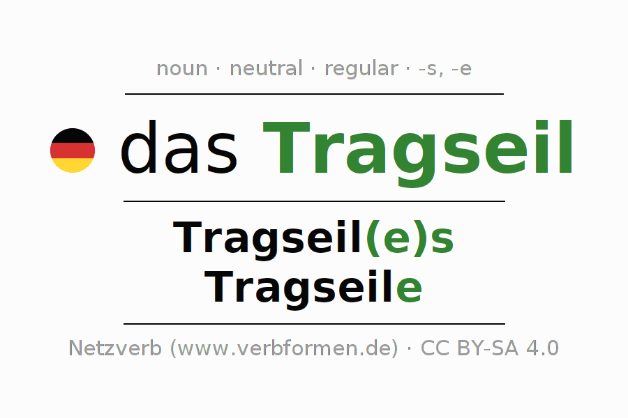 The declension of Tragseil as a table with all forms in singular (singular) and plural (plural) and in all four cases nominative (1st case), genitive (2nd case), dative (3rd case) and accusative (4th case). Especially for German learners the correct declension of the word Tragseil is crucial.