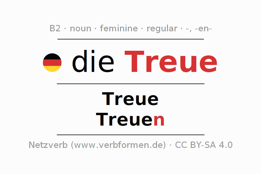 The declension of Treue as a table with all forms in singular (singular) and plural (plural) and in all four cases nominative (1st case), genitive (2nd case), dative (3rd case) and accusative (4th case). Especially for German learners the correct declension of the word Treue is crucial.