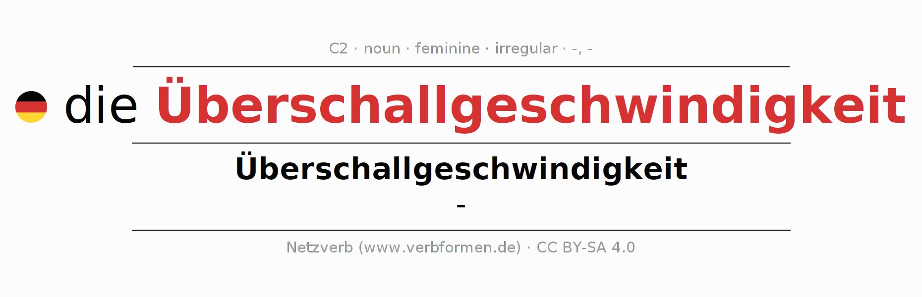 The declension of Überschallgeschwindigkeit as a table with all forms in singular (singular) and plural (plural) and in all four cases nominative (1st case), genitive (2nd case), dative (3rd case) and accusative (4th case). Especially for German learners the correct declension of the word Überschallgeschwindigkeit is crucial.