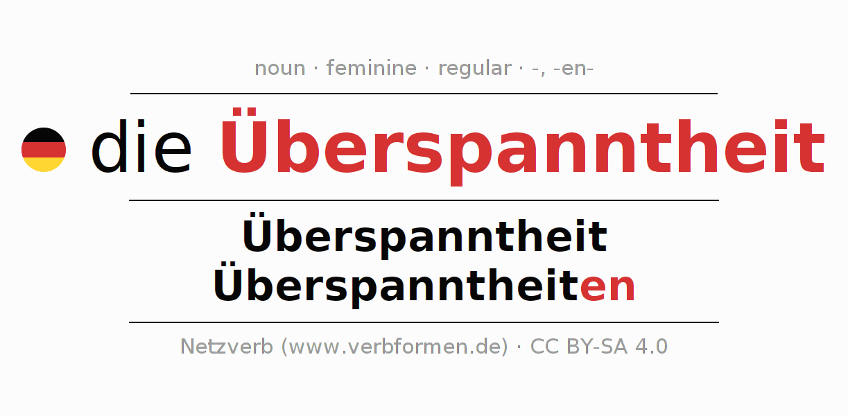 The declension of Überspanntheit as a table with all forms in singular (singular) and plural (plural) and in all four cases nominative (1st case), genitive (2nd case), dative (3rd case) and accusative (4th case). Especially for German learners the correct declension of the word Überspanntheit is crucial.