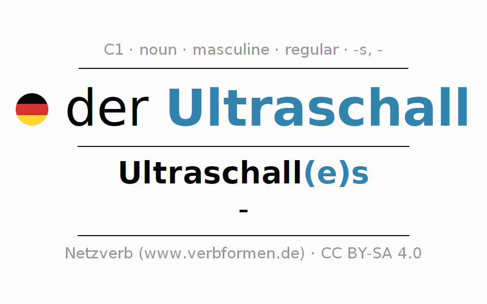 The declension of Ultraschall as a table with all forms in singular (singular) and plural (plural) and in all four cases nominative (1st case), genitive (2nd case), dative (3rd case) and accusative (4th case). Especially for German learners the correct declension of the word Ultraschall is crucial.