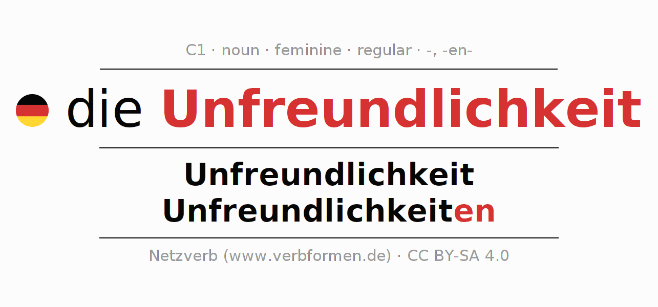 The declension of Unfreundlichkeit as a table with all forms in singular (singular) and plural (plural) and in all four cases nominative (1st case), genitive (2nd case), dative (3rd case) and accusative (4th case). Especially for German learners the correct declension of the word Unfreundlichkeit is crucial.