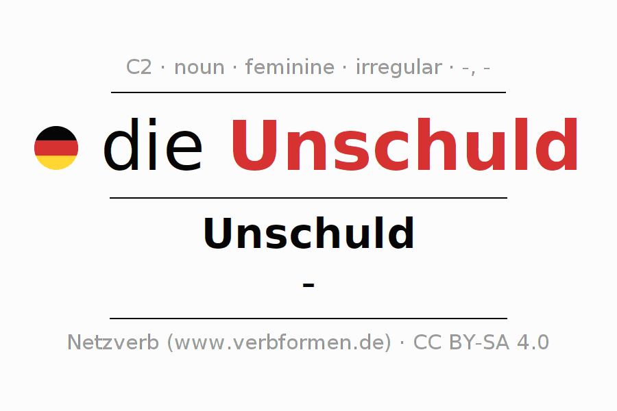 The declension of Unschuld as a table with all forms in singular (singular) and plural (plural) and in all four cases nominative (1st case), genitive (2nd case), dative (3rd case) and accusative (4th case). Especially for German learners the correct declension of the word Unschuld is crucial.