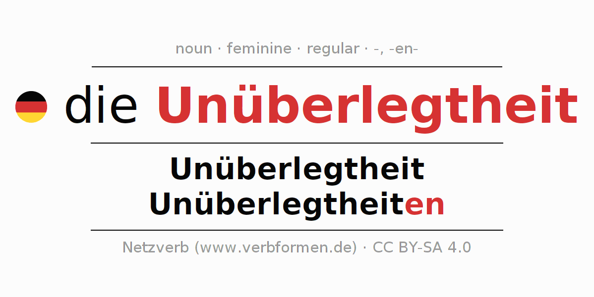 The declension of Unüberlegtheit as a table with all forms in singular (singular) and plural (plural) and in all four cases nominative (1st case), genitive (2nd case), dative (3rd case) and accusative (4th case). Especially for German learners the correct declension of the word Unüberlegtheit is crucial.