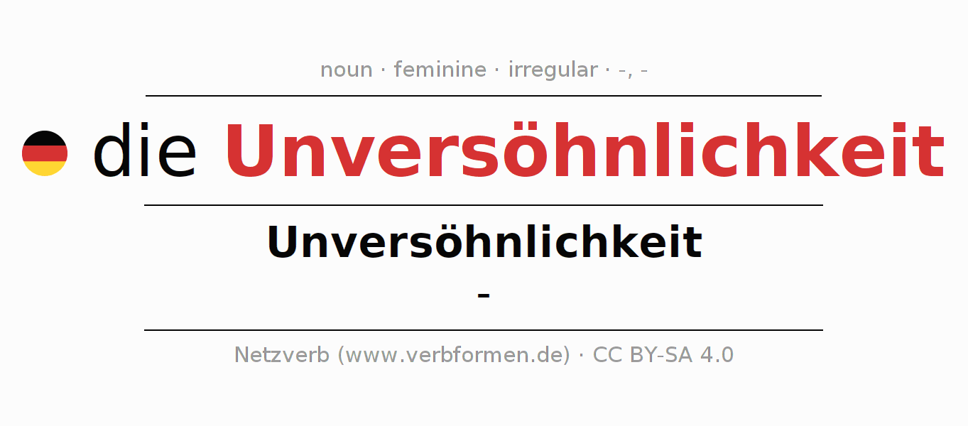 The declension of Unversöhnlichkeit as a table with all forms in singular (singular) and plural (plural) and in all four cases nominative (1st case), genitive (2nd case), dative (3rd case) and accusative (4th case). Especially for German learners the correct declension of the word Unversöhnlichkeit is crucial.