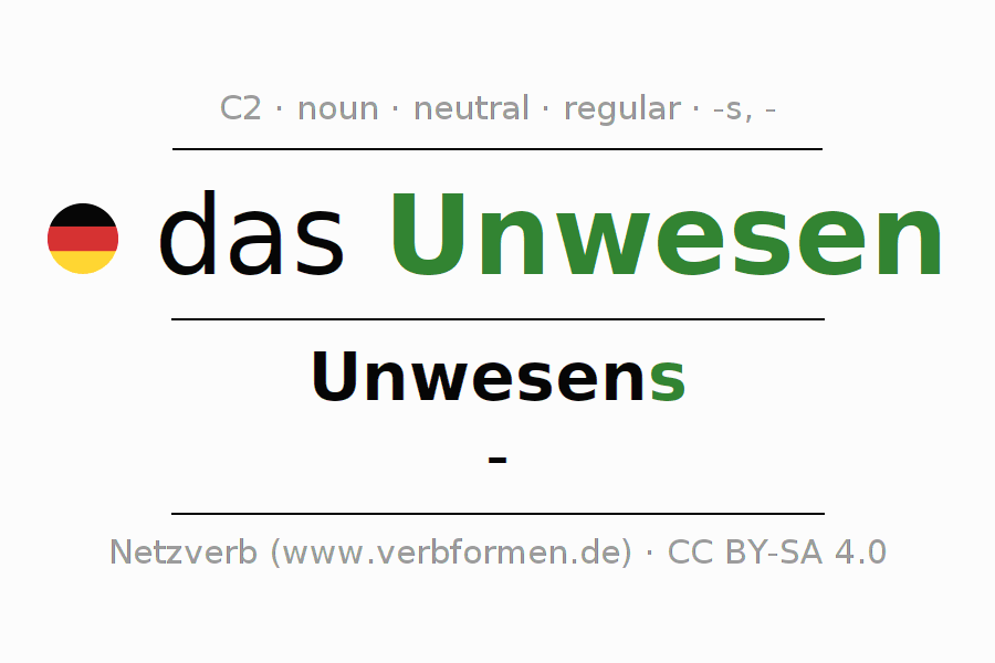 The declension of Unwesen as a table with all forms in singular (singular) and plural (plural) and in all four cases nominative (1st case), genitive (2nd case), dative (3rd case) and accusative (4th case). Especially for German learners the correct declension of the word Unwesen is crucial.