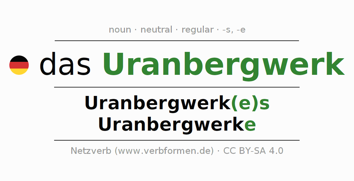 The declension of Uranbergwerk as a table with all forms in singular (singular) and plural (plural) and in all four cases nominative (1st case), genitive (2nd case), dative (3rd case) and accusative (4th case). Especially for German learners the correct declension of the word Uranbergwerk is crucial.