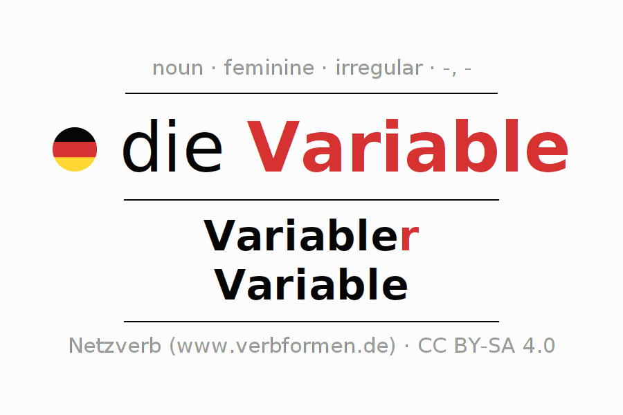 - Plural: die Variablen, der Variablen, den Variablen, die Variablen