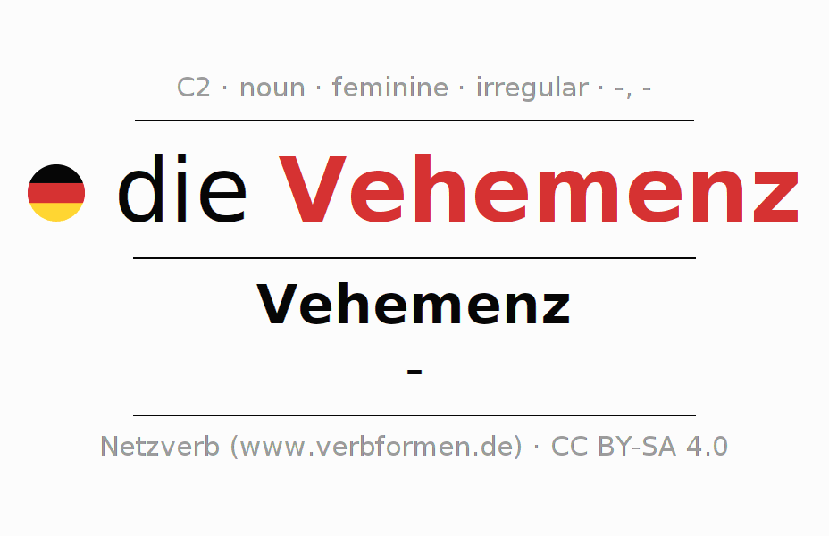 The declension of Vehemenz as a table with all forms in singular (singular) and plural (plural) and in all four cases nominative (1st case), genitive (2nd case), dative (3rd case) and accusative (4th case). Especially for German learners the correct declension of the word Vehemenz is crucial.