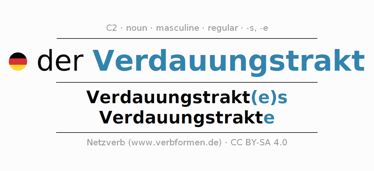 The declension of Verdauungstrakt as a table with all forms in singular (singular) and plural (plural) and in all four cases nominative (1st case), genitive (2nd case), dative (3rd case) and accusative (4th case). Especially for German learners the correct declension of the word Verdauungstrakt is crucial.