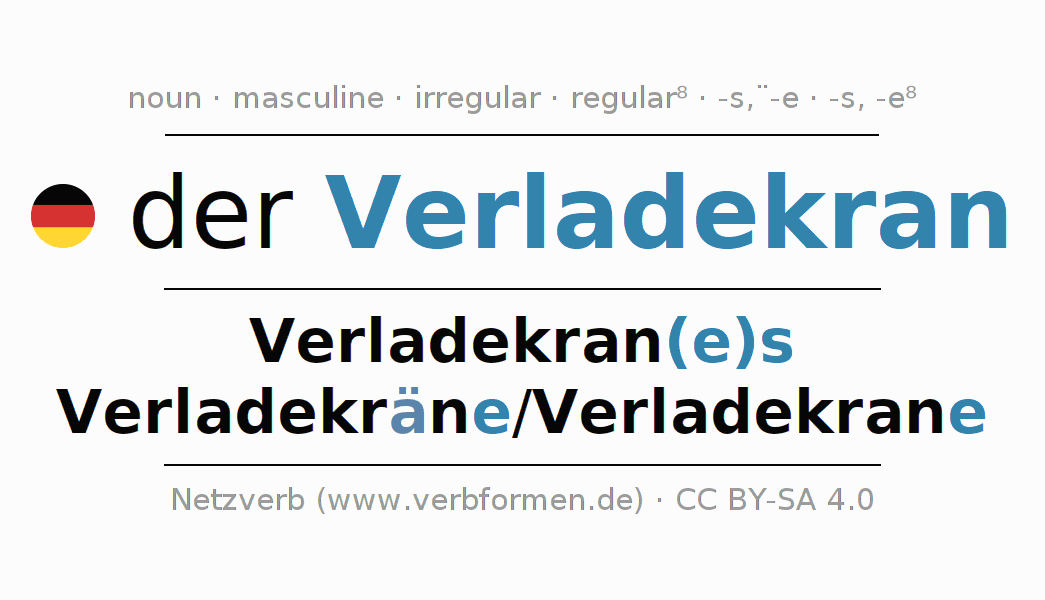 - Plural: die Verladekräne/Verladekrane, der Verladekräne/Verladekrane, den Verladekränen/Verladekranen, die Verladekräne/Verladekrane