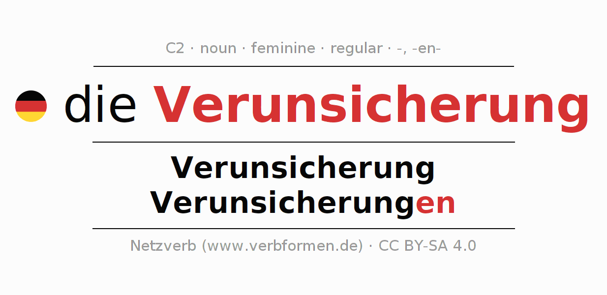 The declension of Verunsicherung as a table with all forms in singular (singular) and plural (plural) and in all four cases nominative (1st case), genitive (2nd case), dative (3rd case) and accusative (4th case). Especially for German learners the correct declension of the word Verunsicherung is crucial.
