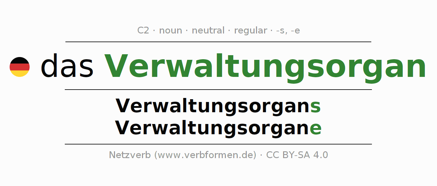 - Singular: das Verwaltungsorgan, des Verwaltungsorgans, dem Verwaltungsorgan, das Verwaltungsorgan