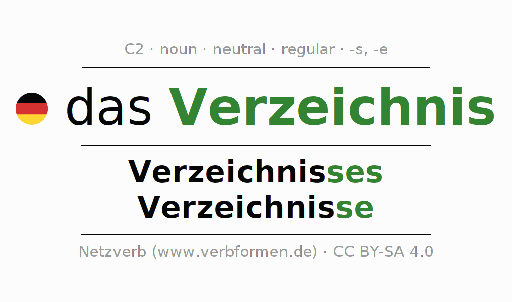 - Plural: die Verzeichnisse, der Verzeichnisse, den Verzeichnissen, die Verzeichnisse